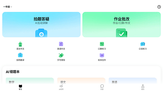 作业批改:作业完成后不知道对错?全学科批改,错题收录,AI 分析错因并推荐必练题,让学习更高效。